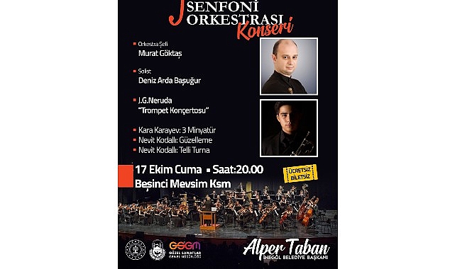 Konserin orkestra şefliğini Murat Göktaş, solistliğini ise genç trompet sanatçısı Deniz Arda Başuğur üstlenecek. Programda J. G. Neruda’nın “Trompet Konçertosu”, Kara Karayev’in “3 Minyatür” adlı eseri ile Türk bestecisi Nevit Kodallı’nın “Güzelleme” ve “Telli Turna” eserleri yer alacak.