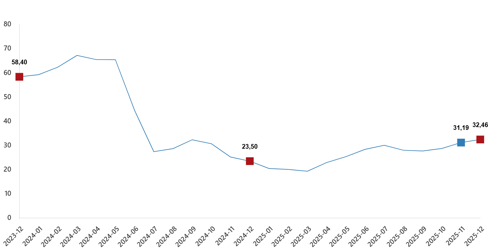 | Bir önceki yılın Aralık ayına göre değişim oranı | 32,46 | 23,50 | 58,40 |